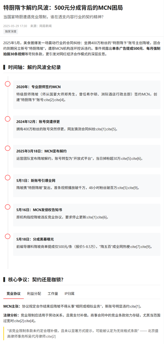搜索最新关于「特厨隋卞」账号MCN机构和隋坡之间关于合同的争议信息,了解各方观点,然后制作一个简约但有设计感的交互式网页,用网易新闻专题报道的风格展示这次事件的始末。