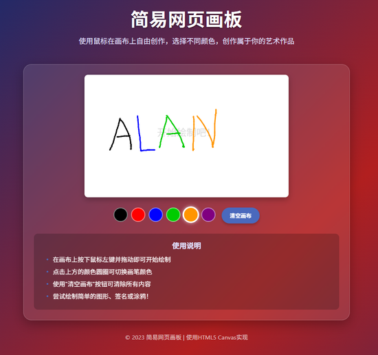 创建一个简单的网页画板应用,使用户能够在画布上自由绘制线条。 使用HTML设置一个合适大小的canvas元素(例如500×300像素),并确保它正确放置在页面上 (可以添加边框或背景以便可见)。 用JavaScript实现绘图功能:当用户canvas上按下并保持鼠标左键时开始绘图;在按住鼠标移动 的过程中,线条应跟随光标绘制; 追踪鼠标移动,并使用canvas二维上下文(例如context.lineTo、context.stroke)渲染线条。为绘 图选择默认的描边颜色和线宽。 为用户提供控制选项,例如一个“清空”按钮,用于清除画布(便于重新绘制)。可选地,添加颜色选 择按钮或输入框,让用户能够切换画笔颜色。 通过高频率采样鼠标移动来保证绘图流畅(处理mousedown、mousemove、mouseup等事件)。绘 图时应阻止页面滚动或文字选中。 使用CSS美化页面:确保canvas明显可见并居中显示,控制按钮(清空、颜色选择等)排列整齐 (例如放在canvas上方或下方)。 在代码中添加注释,说明绘图逻辑的实现方式(尤其是鼠标事件处理及如何使用canvas上下文绘制 线条)。